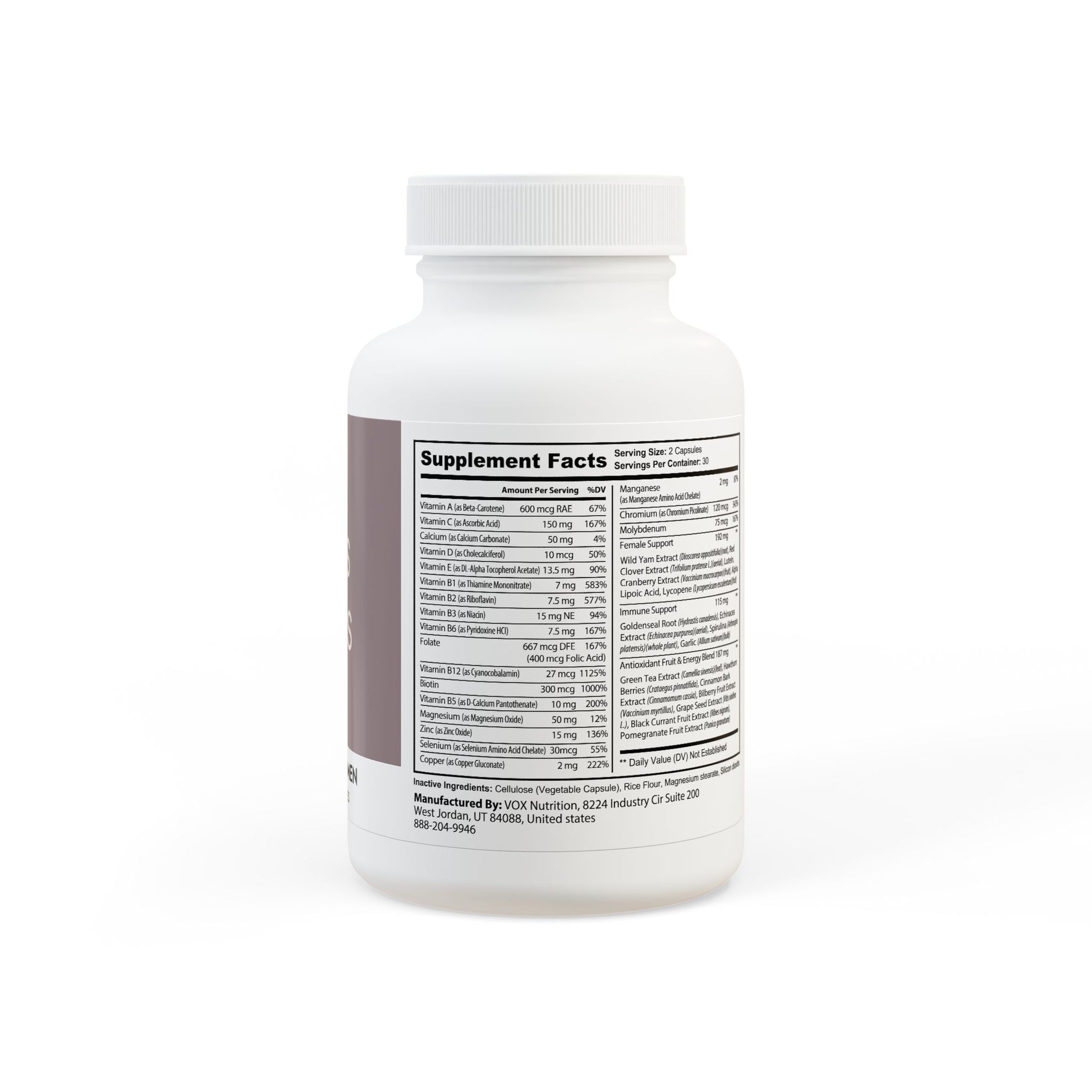 Key ingredients include Vitamin A, Vitamin C, Calcium, Vitamin D, Vitamin E, Vitamin B1, Vitamin B2, Vitamin B3, Vitamin B6, Folate, Vitamin B12, Biotin, Vitamin B5, Magnesium, Zinc, Selenium, Copper, Manganese, Chromium, Molybdenum, Wild Yam Extract, Red Clover Extract, Lutein, Cranberry Extract, Spirulina, Garlic, Green Tea Extract, Hawthorn Berries, Cinnamon Bark Extract, Grape Seed Extract, Black Currant Fruit Extract, and Pomegranate Fruit Extract.